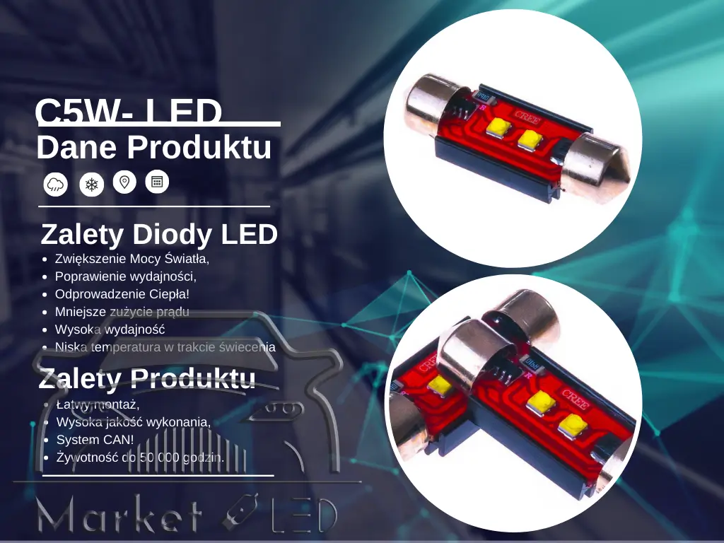 Żarówka LED C5W wyposażona jest w dwie wysokiej jakości diody CREE, które emitują jasną, białą wiązkę światła o mocy 350 lumenów.