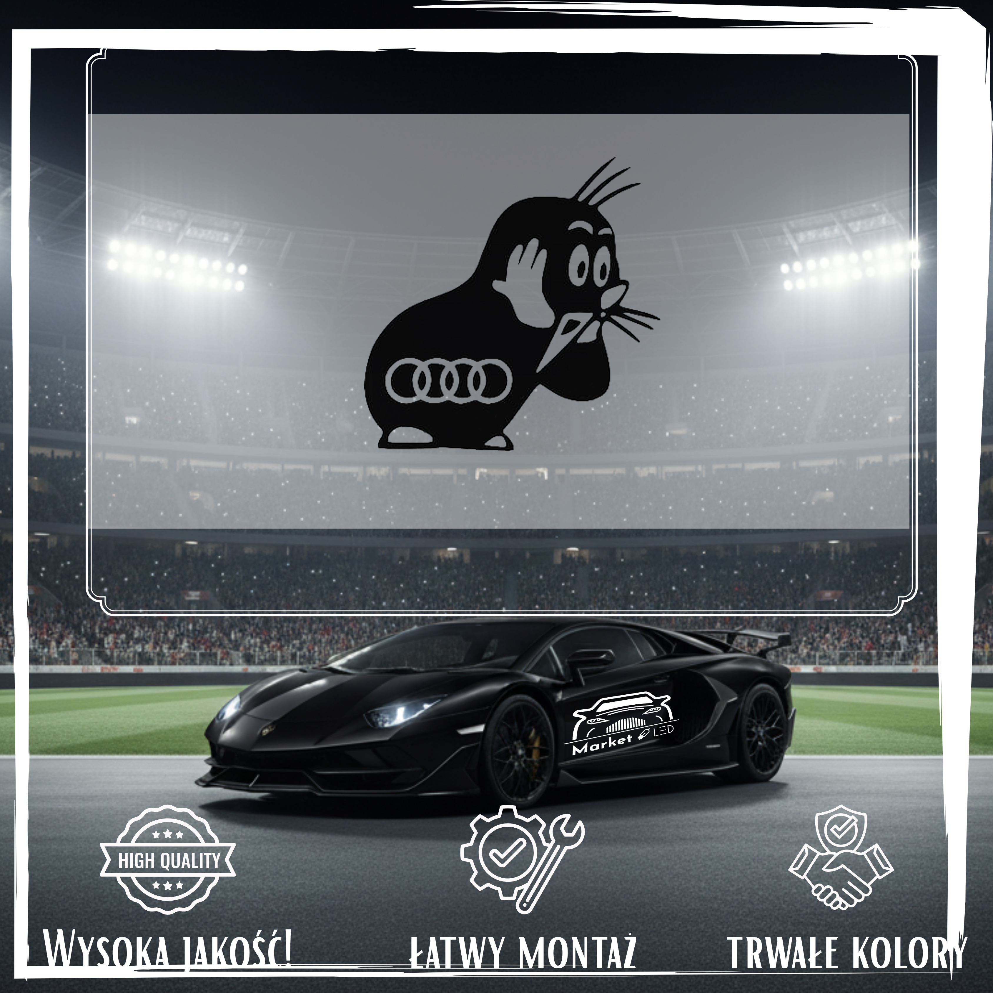 Szukasz efektownej i trwałej naklejki na samochód? Postaw na wyrazisty wzór KRECIK Z LOGO AUDI, precyzyjnie wycinany ploterem. Zapewniamy, że to nie jest zwykły nadruk, lecz profesjonalna folia ORACAL – maksymalna odporność na deszcz, słońce i ekstremalne temperatury.