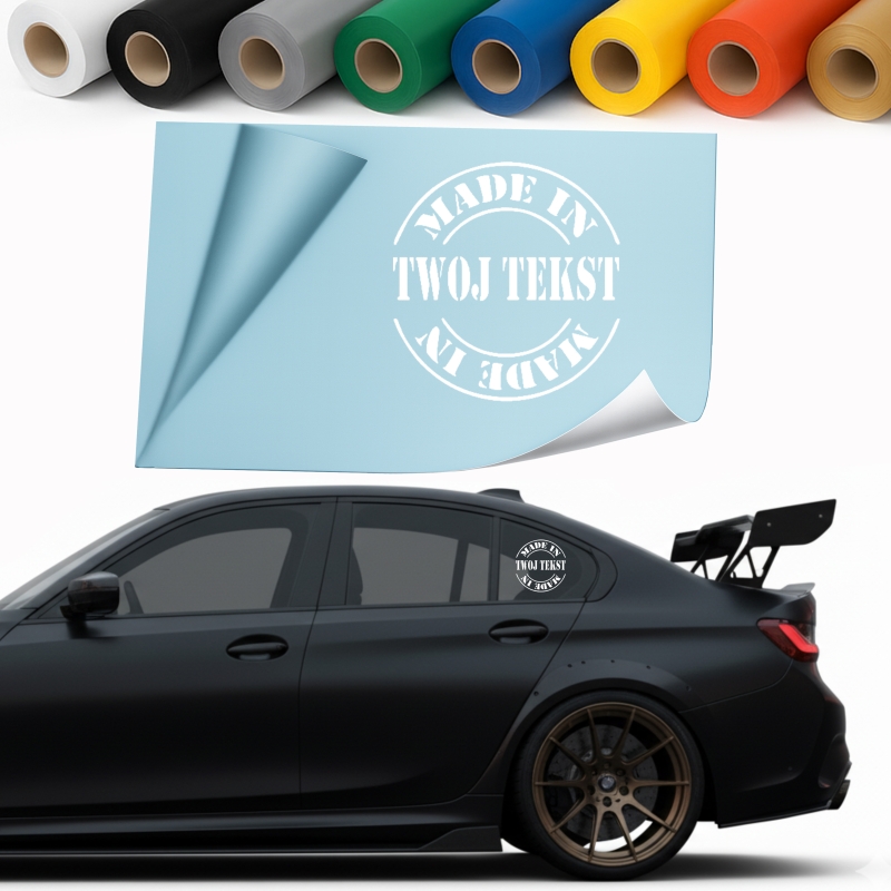 Szukasz efektownej i trwałej naklejki na samochód? Postaw na wyrazisty wzór MADE IN... + Twój Tekst, precyzyjnie wycinany ploterem. Zapewniamy, że to nie jest zwykły nadruk, lecz profesjonalna folia ORACAL – maksymalna odporność na deszcz, słońce i ekstremalne temperatury.