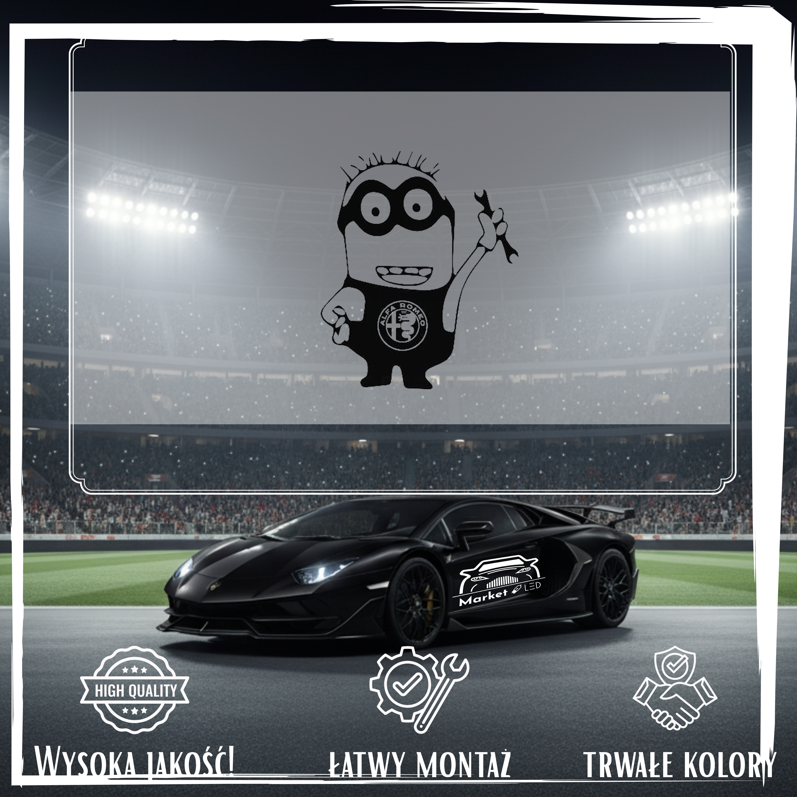 Szukasz efektownej i trwałej naklejki na samochód? Postaw na wyrazisty wzór MINIONEK Alfa Romeo, precyzyjnie wycinany ploterem. Zapewniamy, że to nie jest zwykły nadruk, lecz profesjonalna folia ORACAL – maksymalna odporność na deszcz, słońce i ekstremalne temperatury.