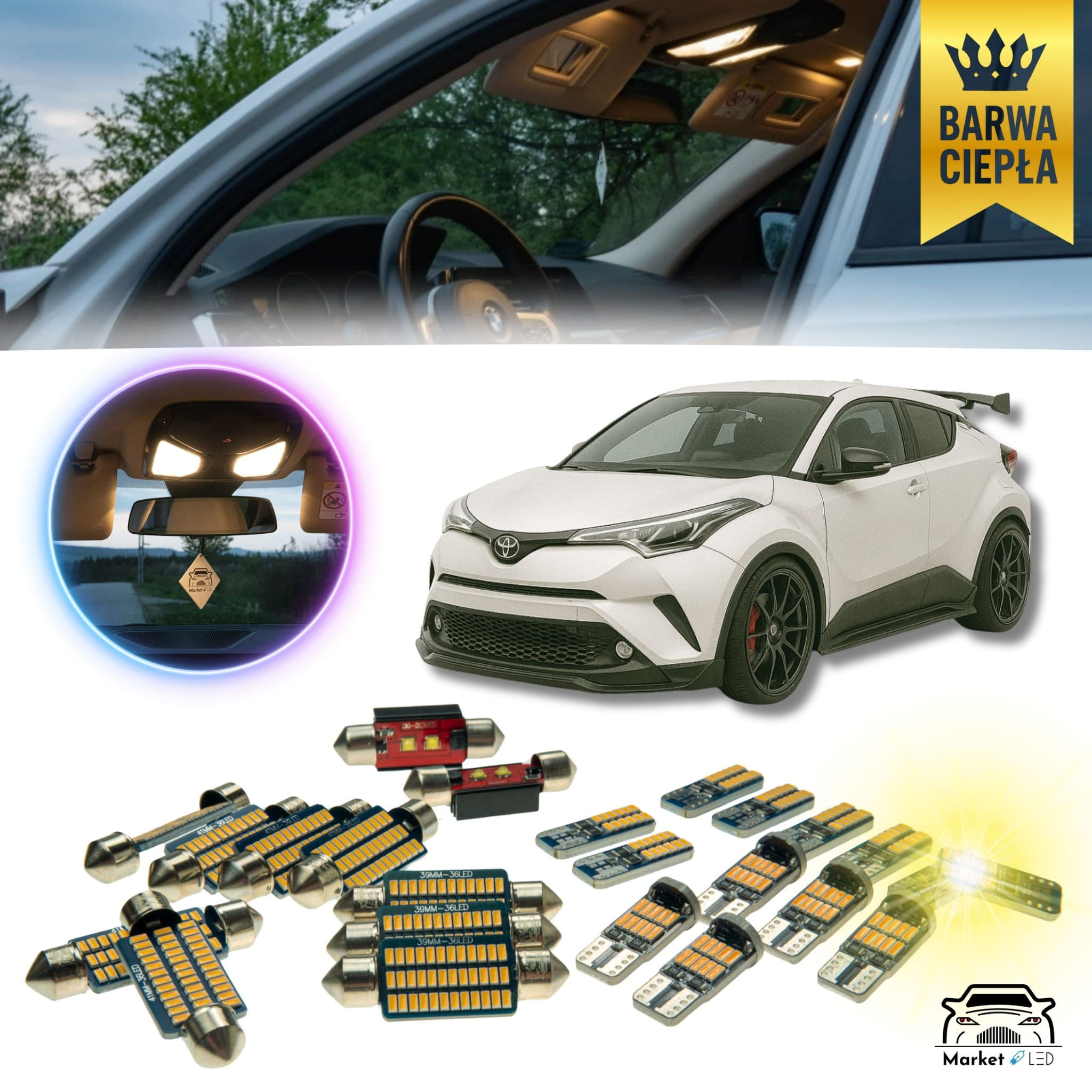Zmień wnętrze swojej Toyoty C-HR na bardziej stylowe i funkcjonalne dzięki naszemu dedykowanemu kompletowi żarówek LED o ciepłej barwie światła!