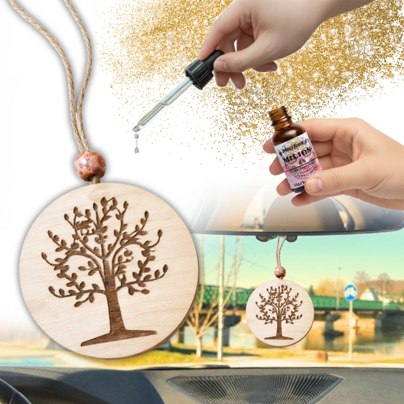 - Okrągłą zawieszkę zapachową z precyzyjnym grawerem drzewa, wykonaną z ekologicznego drewna i chłonnego filcu.