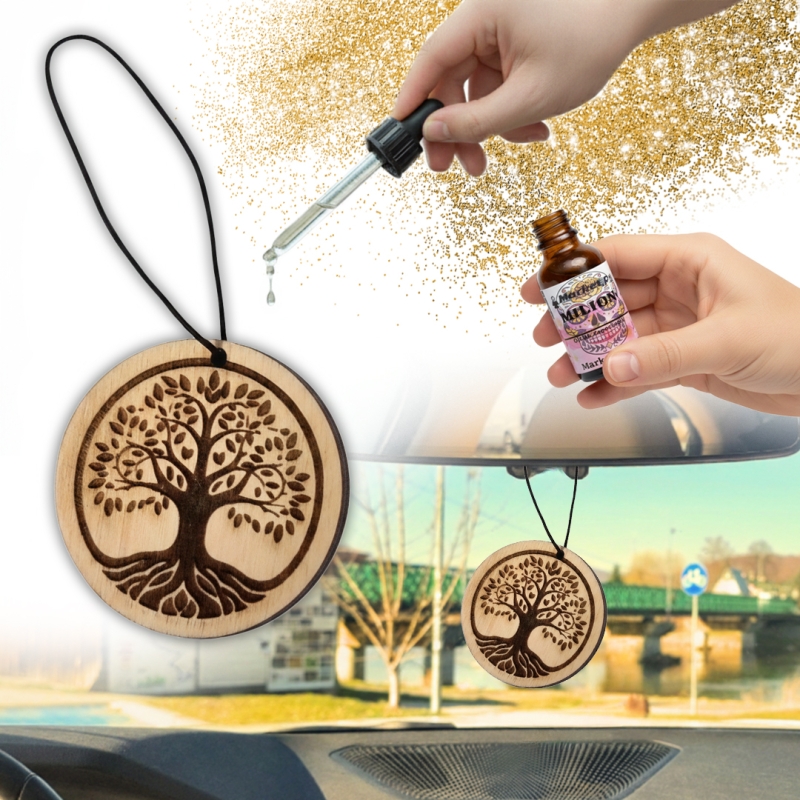 - Zawieszkę zapachową wykonaną z drewnopochodnej płyty HDF i filcu.